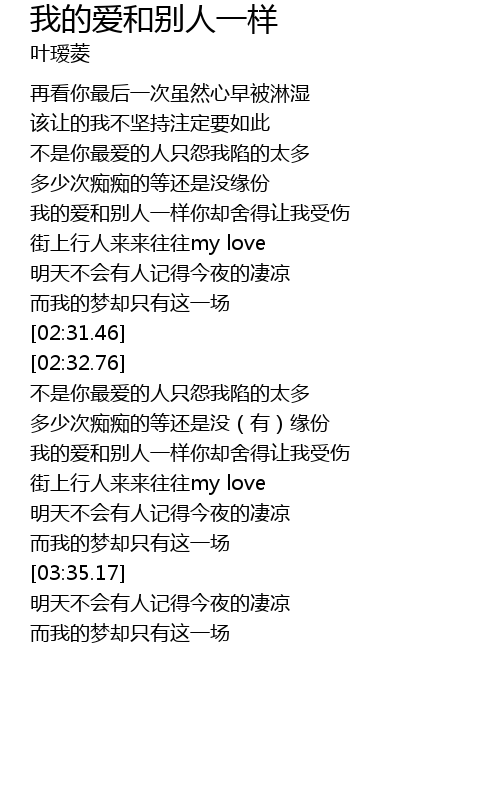 [03:05.86] 我的爱和别人一样你却舍得让我受伤
