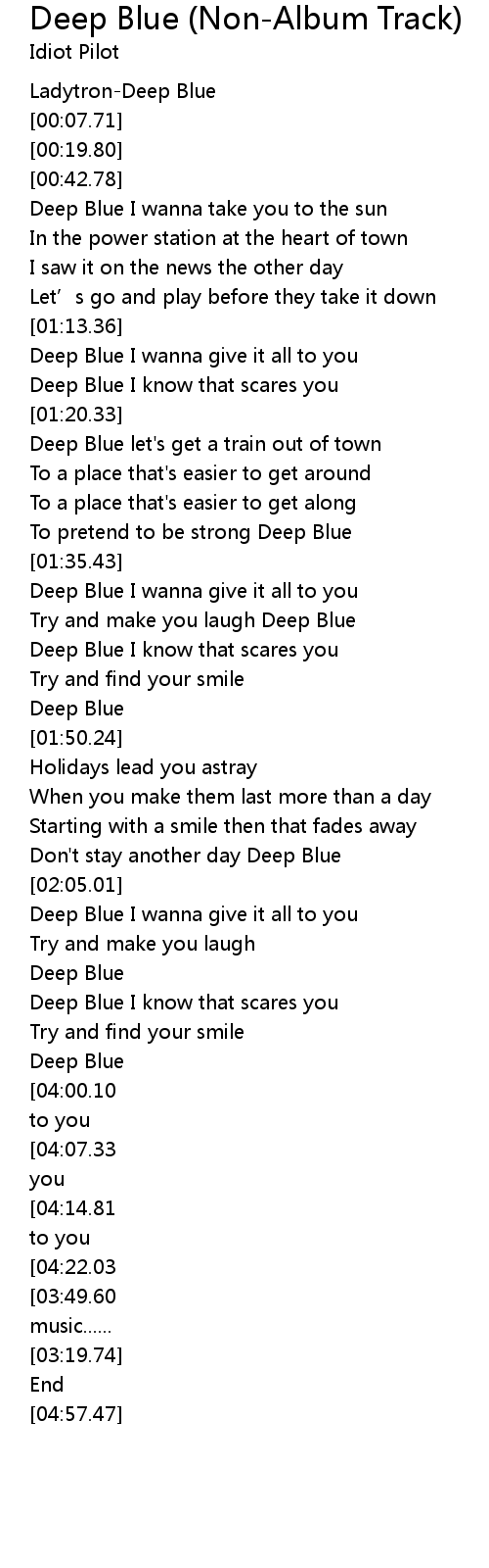 | [04:36.70][04:22.03][03:33.89][02:31.21] | Deep Blue I know that scares you |