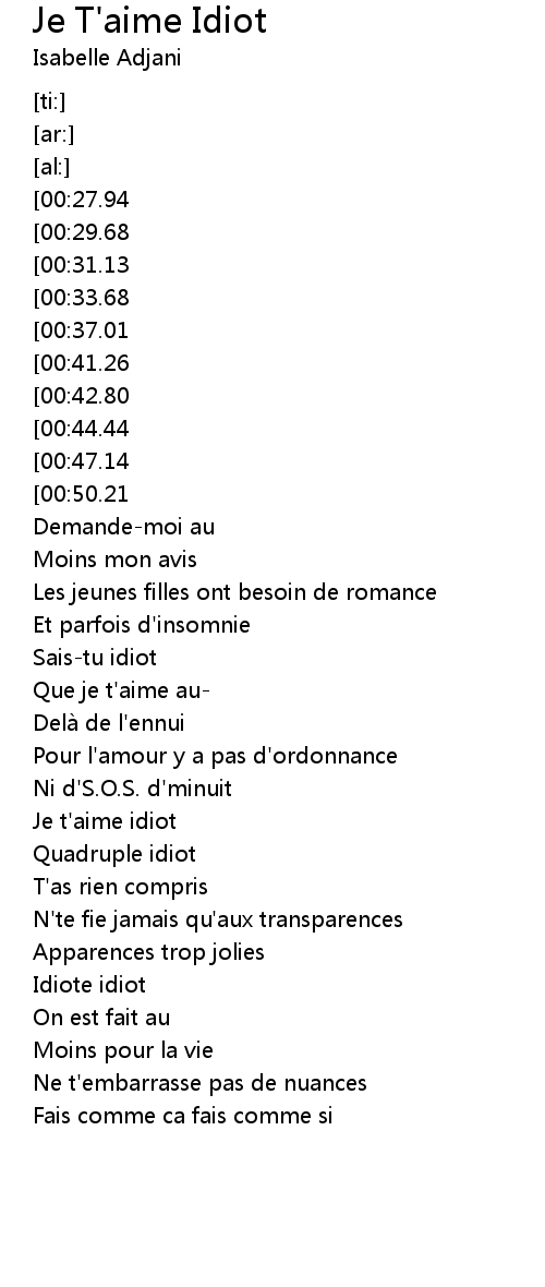 | [02:11.56][00:27.94] | Je t' aime idiot |