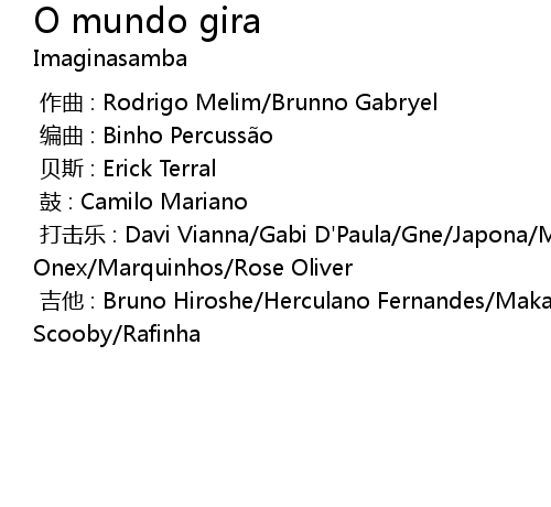 | [00:00.000] | 打击乐 : Davi Vianna/Gabi D'Paula/Gne/Japona/Marcos Onex/Marquinhos/Rose Oliver |