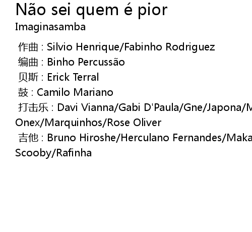 | [00:00.000] | 打击乐 : Davi Vianna/Gabi D'Paula/Gne/Japona/Marcos Onex/Marquinhos/Rose Oliver |