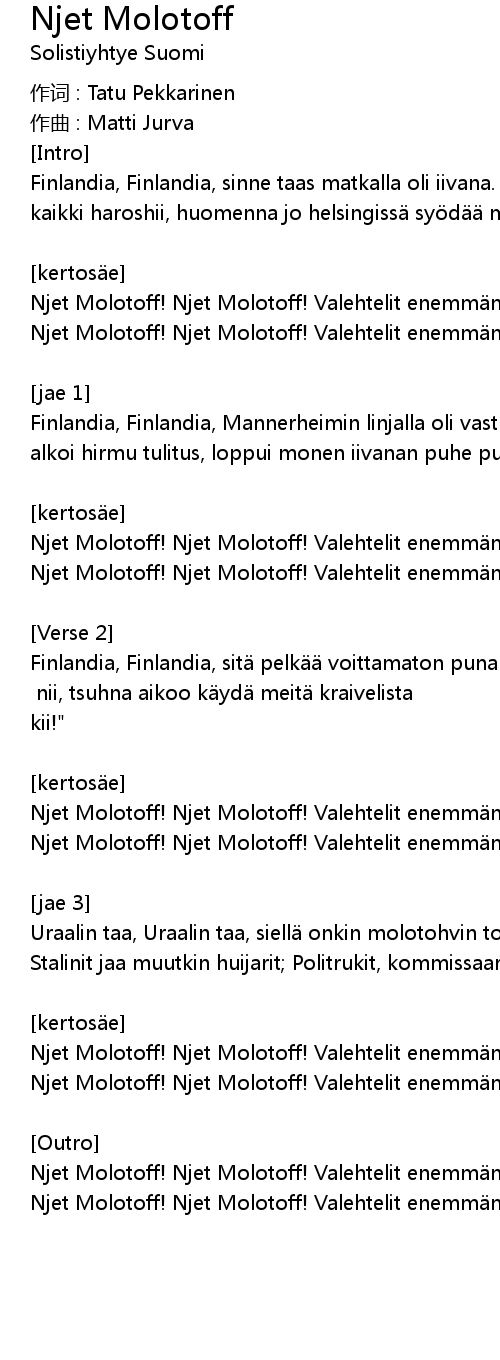| Finlandia, Finlandia, sit pelk voittamaton punaarmeija! Ja molotofkin sanoi ett " katsos torppas? nii, tsuhna aikoo k yd meit kraivelista kii!" | |
