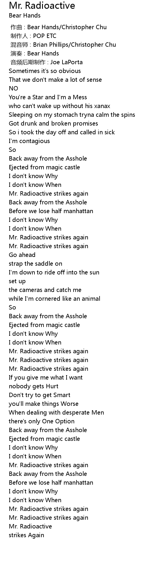 | [00:00.000] | zuo qu : Bear Hands Christopher Chu |