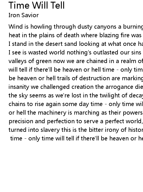 I see is wasted world nothing's outlasted our sins once we've been ruling in valleys of green now we are chained in a realm of the machines time - only time will tell if there'll be heaven or hell time - only time will tell if there'll be heaven or hell trails of destruction are marking the truth testify to insanity we challenged creation the arrogance died atomic thunder was burning the sky seems as we're lost in the twilight of decay unbent we'll break the chains to rise again some day time - only time will tell if there'll be heaven or hell the machinery is marching as their powers are enlarging built with precision and perfection to serve a perfect world, to give protection command turned into slavery this is the bitter irony of history but we will fight [solo Piet] time - only time will tell if there'll be heaven or hell ... |