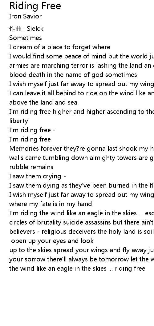 | I' m riding the wind like an eagle in the skies ... escalating violence in circles of brutality suicide assassins but there ain' t no victory fanatic believers religious deceivers the holy land is soiled with blood attack revenge hitech war in the name of god solo Piet open up your eyes and look up to the skies spread your wings and fly away just for a while forget about your sorrow there' ll always be tomorrow let the wind take you far away ride on the wind like an eagle in the skies ... riding free |