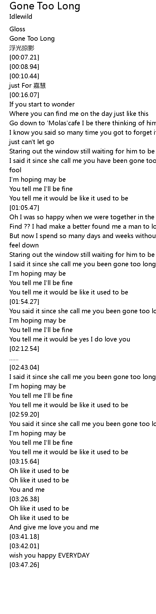 | [00:04.38] | Gone Too Long |