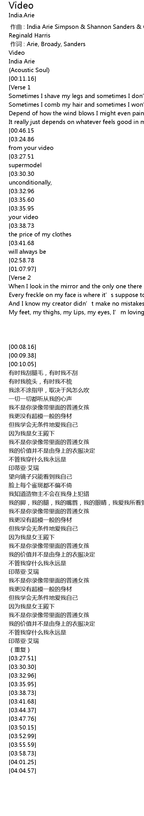 | [03:44.37][02:58.78][01:50.99][01:06.53] | India. Arie |