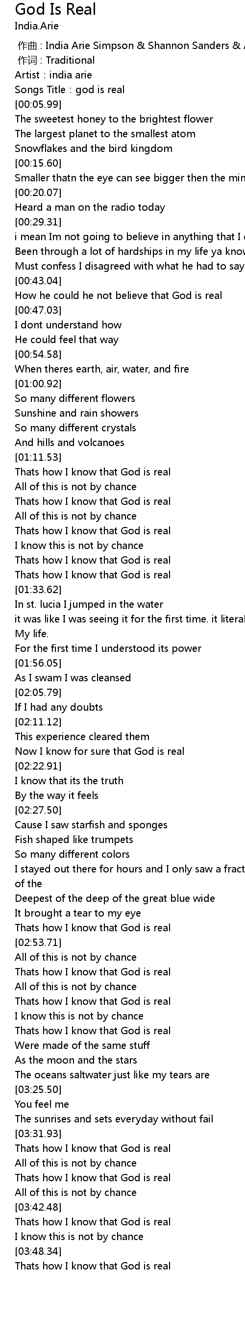 | [03:32.93] | Thats how I know that God is real |
