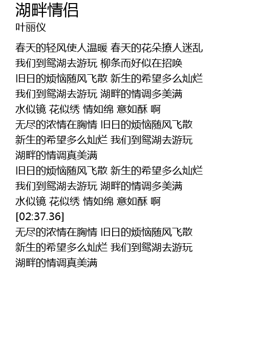 | [01:29.35] | 新生的希望多么灿烂 我们到鸳湖去游玩 湖畔的情调真美满 |
