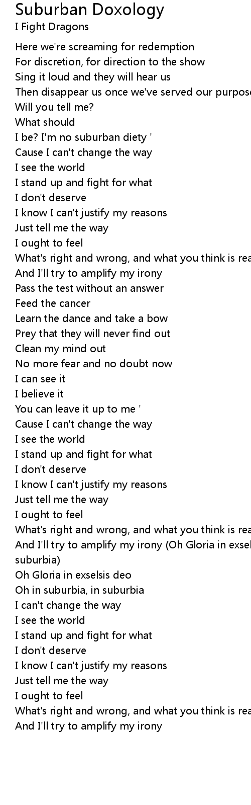 And I'll try to amplify my irony (Oh Gloria in exselsis deo) (Oh in suburbia, in suburbia)