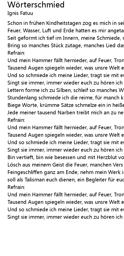 | Und so schmiede ich meine Lieder, tragt sie mit euch Tag fü r Tag. | |