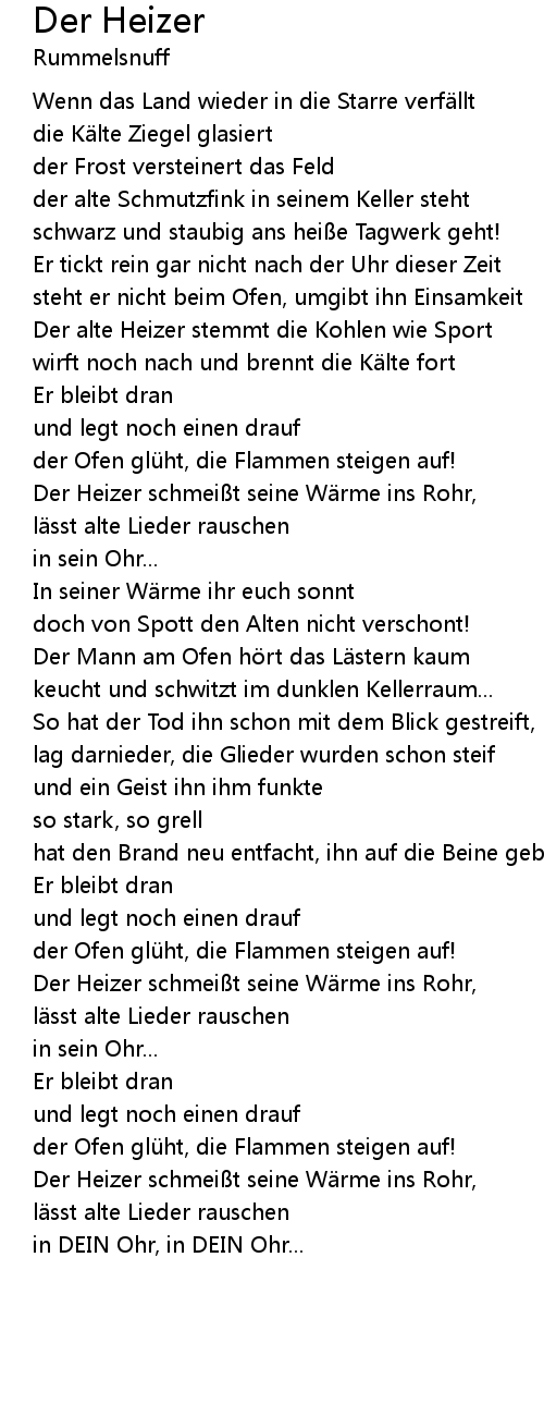 | Der Heizer schmeißt seine Wärme ins Rohr, | |