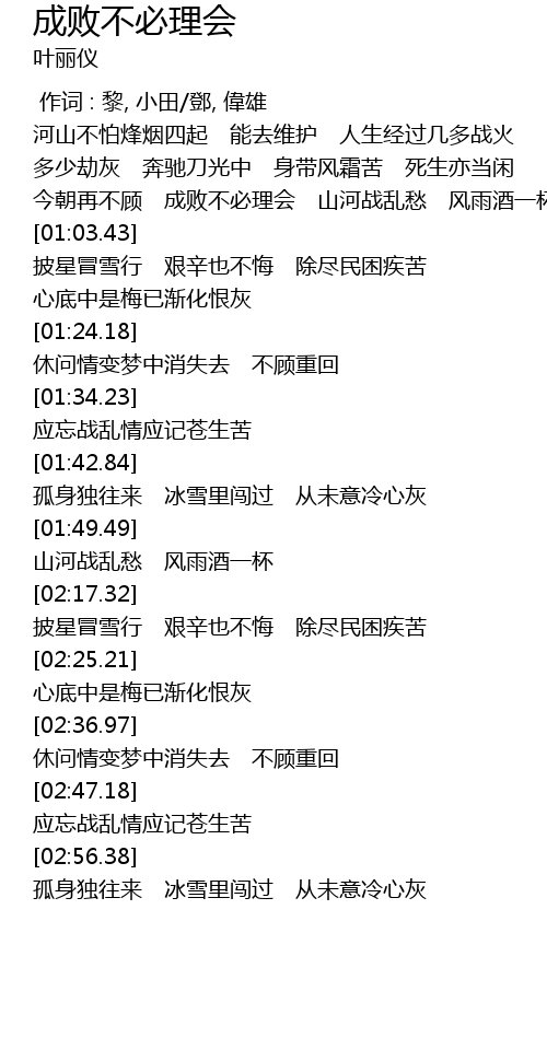 | [00:50.07] | 今朝再不顾 成败不必理会 山河战乱愁 风雨酒一杯 |