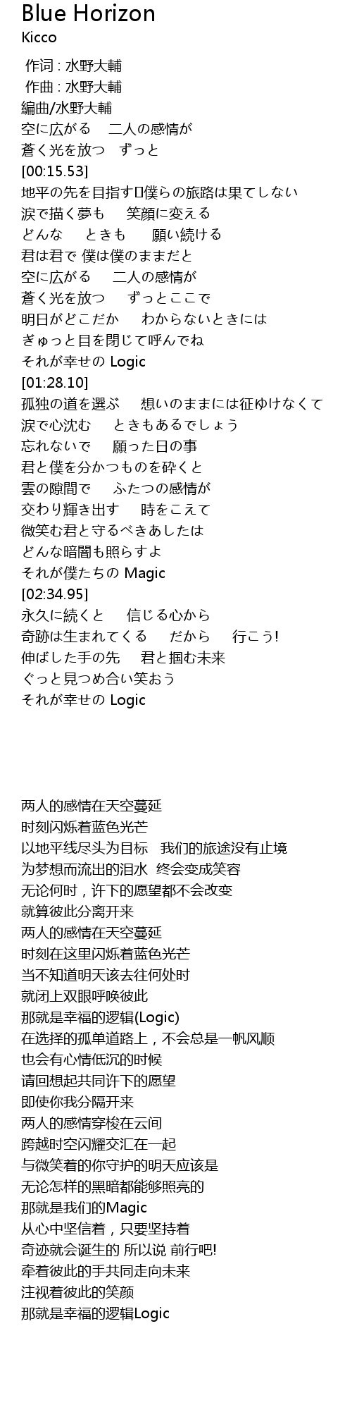| [00:28.78] | 地平の先を目指す 僕らの旅路は果てしない |