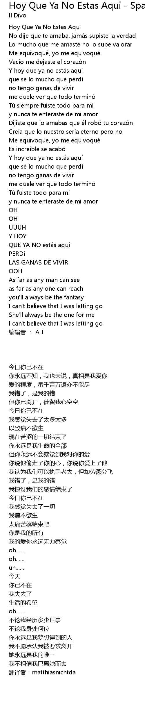 | [00:01.00] | Hoy Que Ya No Estas Aqui |