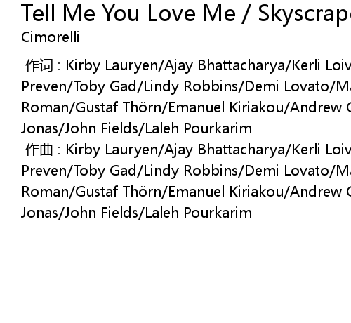 | [00:00.000] | 作曲 : Kirby Lauryen/Ajay Bhattacharya/Kerli Loiv/John Hill/Anne Preven/Toby Gad/Lindy Robbins/Demi Lovato/Mark Landon/Tushar Apte/Sam Roman/Gustaf Thörn/Emanuel Kiriakou/Andrew Goldstein/Nick Jonas/Joe Jonas/Kevin Jonas/John Fields/Laleh Pourkarim |