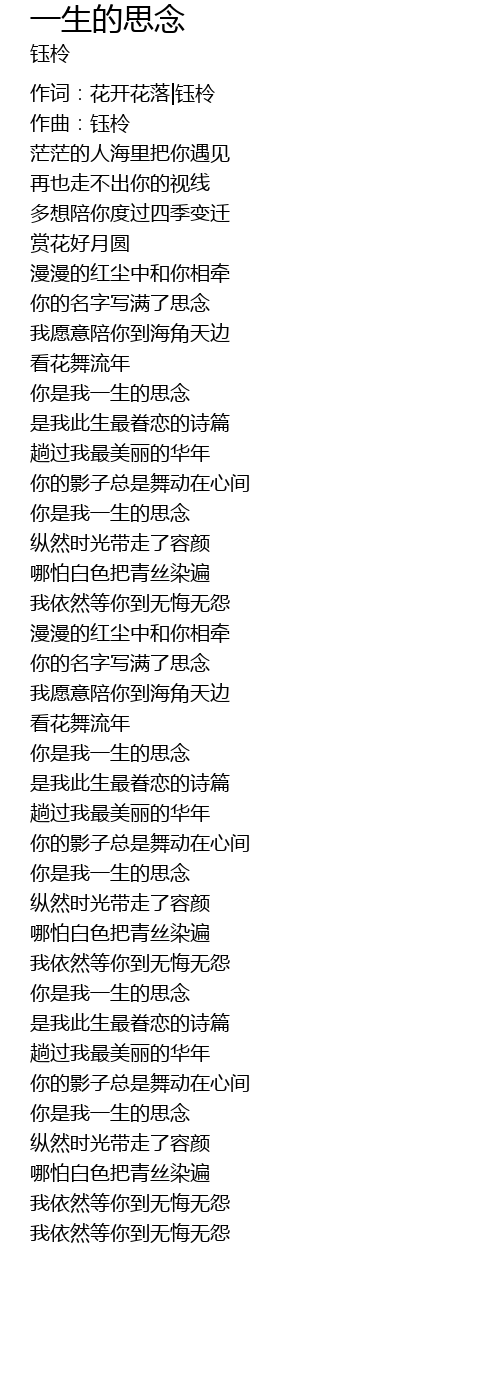 | [01:43.02] | nǐ shì wǒ yī shēng de sī niàn |