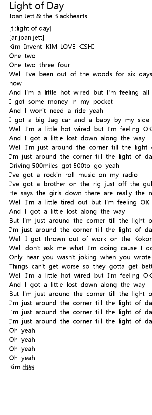 | [01:23.379] | But I'm just around the corner till the light of day yeah |