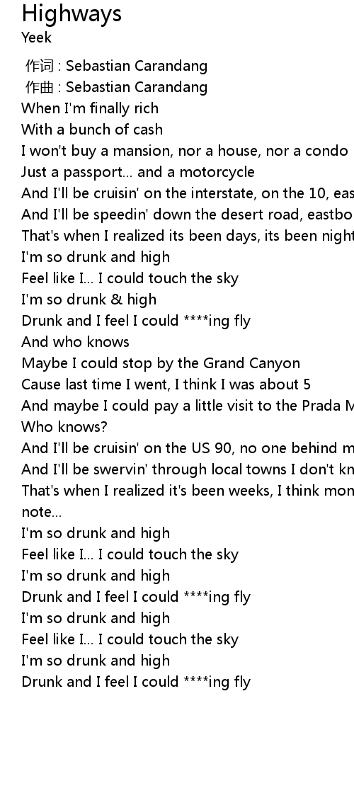 | [01:21.47] | Drunk and I feel I could ****ing fly |