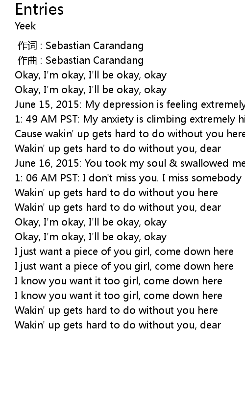 | [00:21.98] | June 15, 2015: My depression is feeling extremely high |