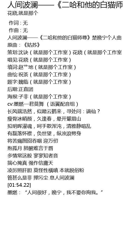 | [00:00.00] | 人间波澜——《二哈和他的白猫师尊》楚晚宁个人曲 |