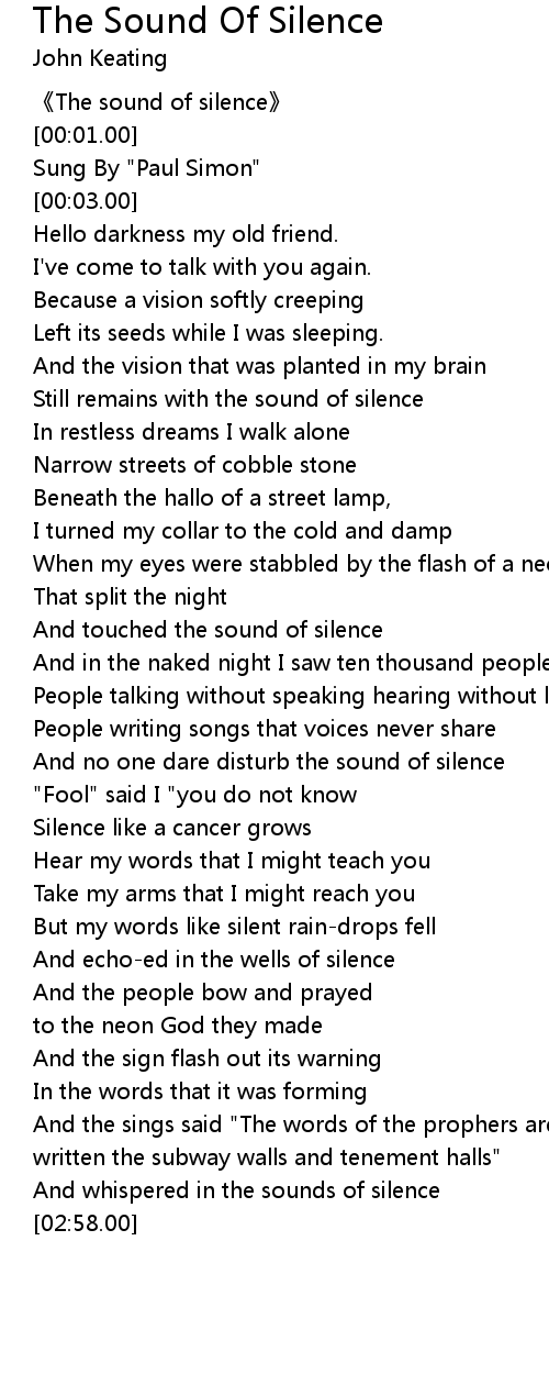 | [01:38.00] | And no one dare disturb the sound of silence |