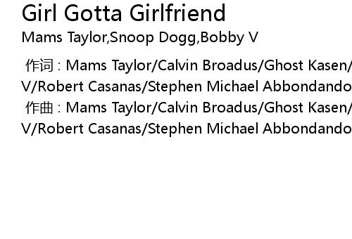 | [00:00.000] | 作词 : Mams Taylor/Calvin Broadus/Ghost Kasen/Benny Cassette/Bobby V/Robert Casanas/Stephen Michael Abbondandolo |