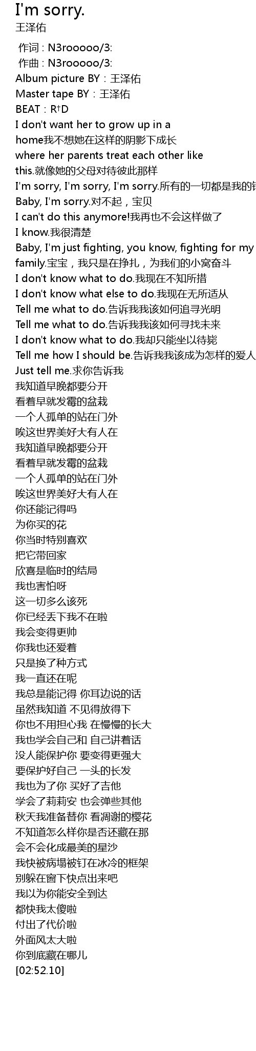 | [00:06.72] | I' m sorry, I' m sorry, I' m sorry. suo you de yi qie dou shi wo de cuo |
