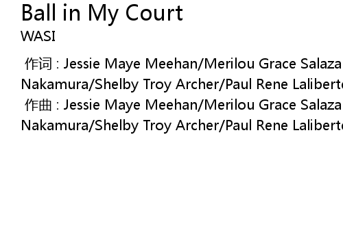 | [00:00.000] | 作词 : Jessie Maye Meehan/Merilou Grace Salazar/Kai Nakamura/Shelby Troy Archer/Paul Rene Laliberte/Jeffrey Scott Laliberte |