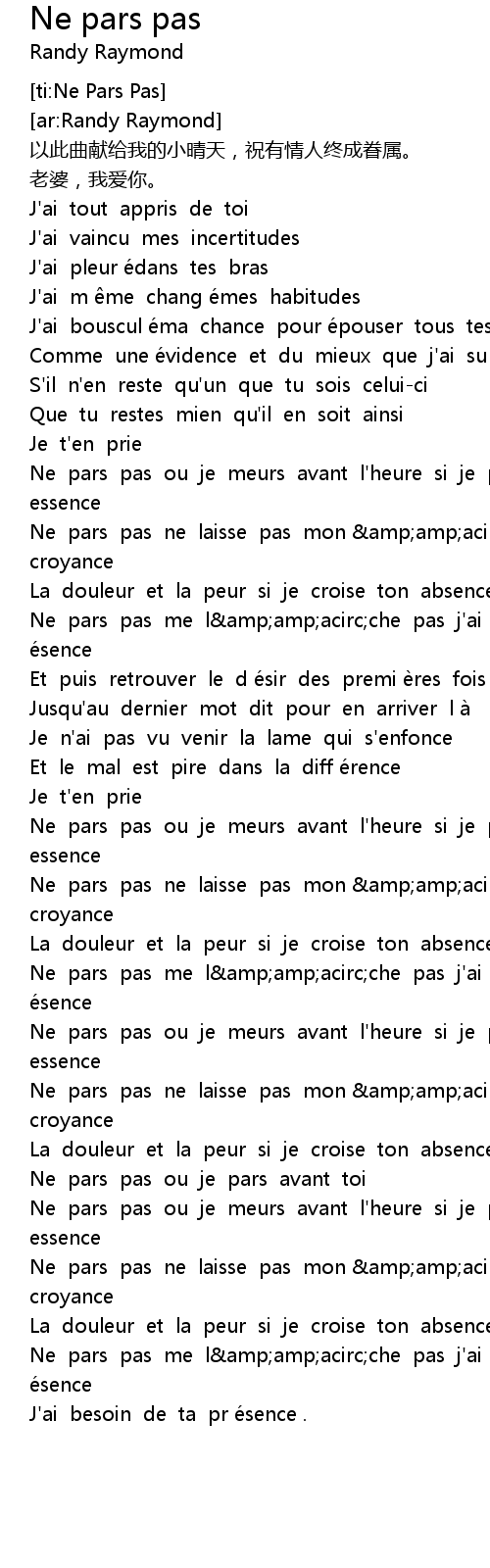 | [02:51.87] | Ne pars pas me l amp amp acirc che pas j' ai besoin de ta pr e sence |