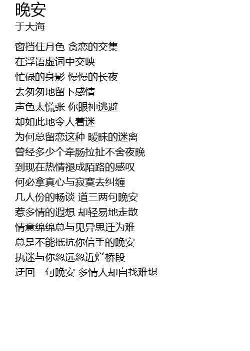 | [01:41.110] | 迂回一句晚安 多情人却自找难堪 |