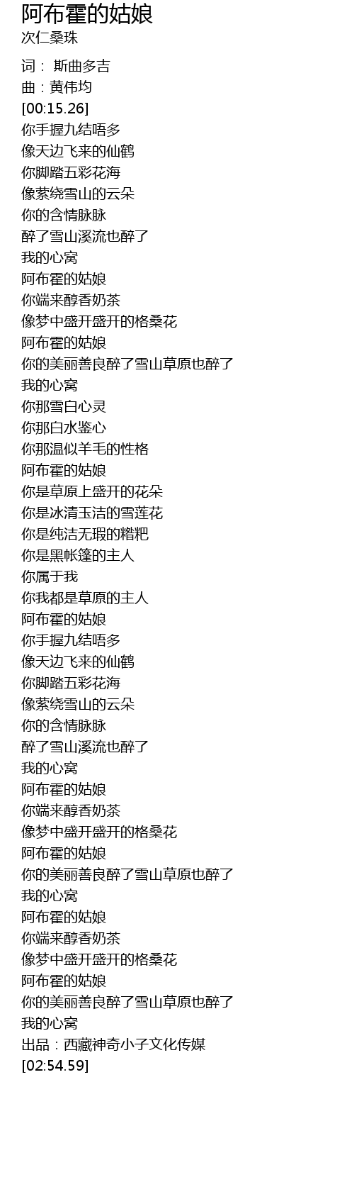| [02:53.45] | 出品:西藏神奇小子文化传媒 |