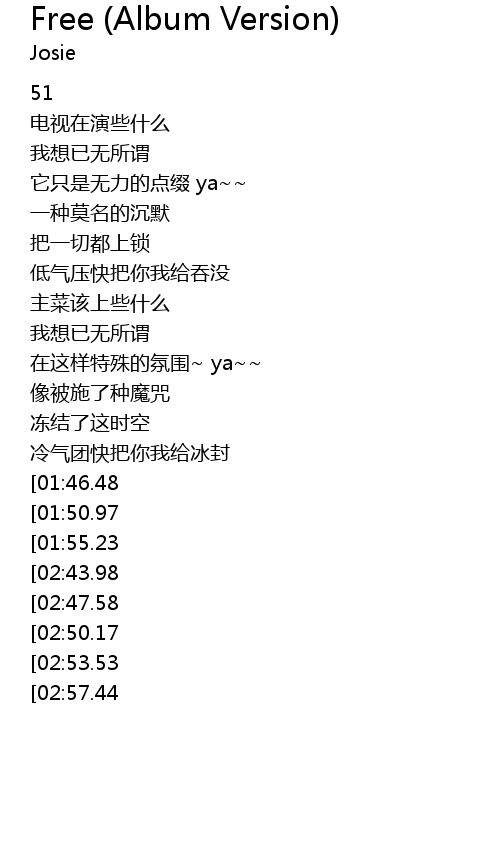 | [02:42.29][01:55.23][00:48.53] | I wanna be free |