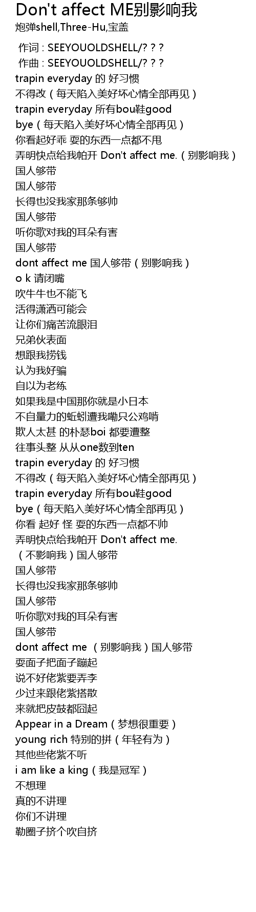 | [00:30.99] | dont affect me 国人够带(别影响我) |