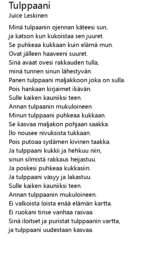 | Ja tulppaani kukkii ja hehkuu niin, | |