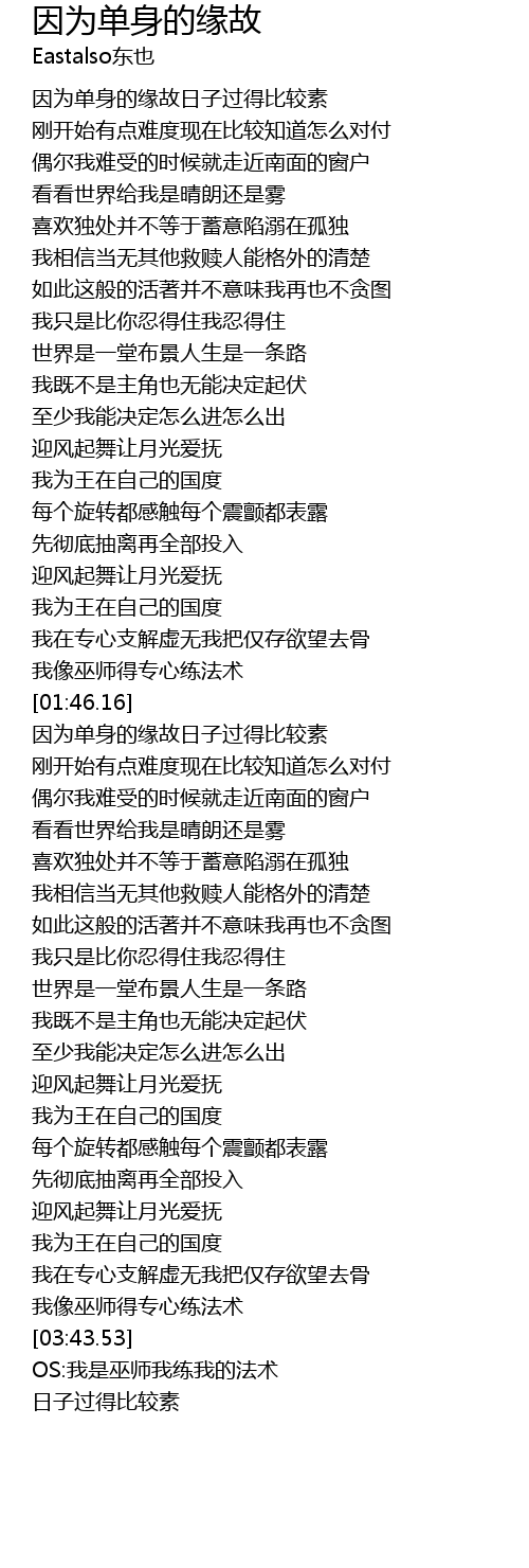 | [00:10.56] | yīn wèi dān shēn de yuán gù rì zi guò de bǐ jiào sù |