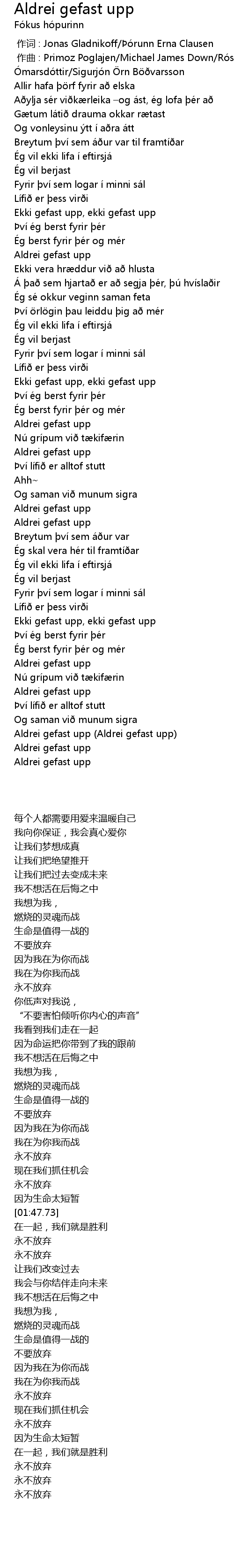 | [02:47.57] | Aldrei gefast upp Aldrei gefast upp |