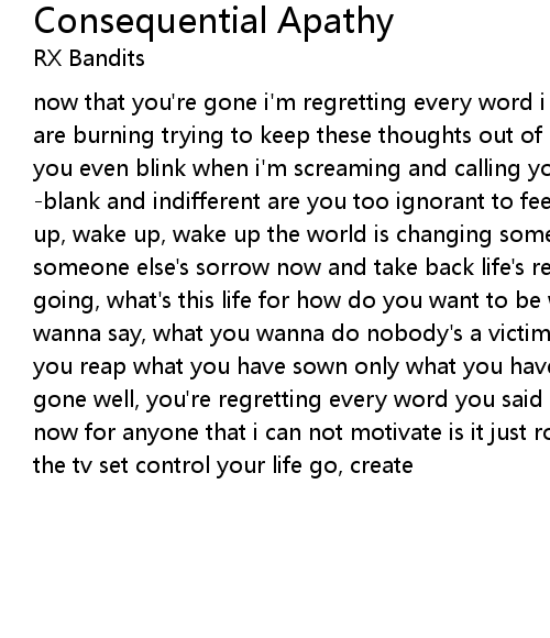 now that you're gone i'm regretting every word i said on this dark day my veins are burning trying to keep these thoughts out of my head so what do you think do you even blink when i'm screaming and calling your name just how i like it -blank and indifferent are you too ignorant to feel the ashamed - chorus - wake up, wake up, wake up the world is changing someone else's sorrow i can't hear it someone else's sorrow now and take back life's remote control - - where you going, what's this life for how do you want to be when you grow old what you wanna say, what you wanna do nobody's a victim its only up to you wise man say you reap what you have sown only what you have sown - chorus - now that you're gone well, you're regretting every word you said i have just one more question now for anyone that i can not motivate is it just routine trained behavior does the tv set control your life go, create |