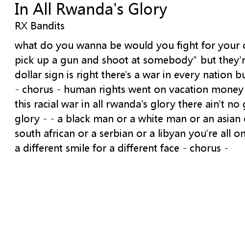 what do you wanna be would you fight for your country leaders say "why don't you pick up a gun and shoot at somebody" but they're only gonna protect you if that dollar sign is right there's a war in every nation but we turn our heads tonight - chorus - human rights went on vacation money took over a long time ago cry for this racial war in all rwanda's glory there ain't no glory in a war ain't no glory - - a black man or a white man or an asian or a mexican or an african or a south african or a serbian or a libyan you're all one race, the human race just a different smile for a different face - chorus - |