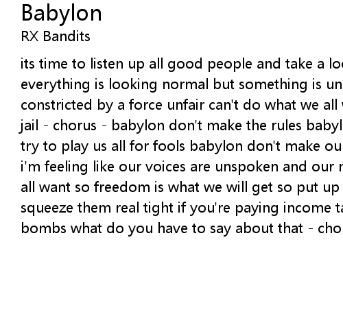 its time to listen up all good people and take a look around i know that everything is looking normal but something is unsound it seems to me that we are constricted by a force unfair can't do what we all want to or you'll wind up in jail - chorus - babylon don't make the rules babylon don't make our rules they try to play us all for fools babylon don't make our rules allright, allright - - i'm feeling like our voices are unspoken and our needs unmet freedom is what we all want so freedom is what we will get so put up all your hands together and squeeze them real tight if you're paying income tax then you're helping to build bombs what do you have to say about that - chorus - |