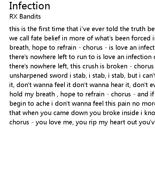 this is the first time that i've ever told the truth before to scrutinize what we call fate belief in more of what's been forced into subconscious's hold my breath, hope to refrain - chorus - is love an infection or a sick addiction when there's nowhere left to run to is love an infection or a sick addiction when there's nowhere left, this crush is broken - chorus - her empty needle is my unsharpened sword i stab, i stab, i stab, but i can't puncture don't wanna let it, don't wanna feel it don't wanna hear it, don't even wanna think about it hold my breath , hope to refrain - chorus - and if i can't afford her my veins begin to ache i don't wanna feel this pain no more have you ever felt so high that when you came down you broke inside i know she won't take the blame - chorus - you love me, you rip my heart out you've broken me for to long now |