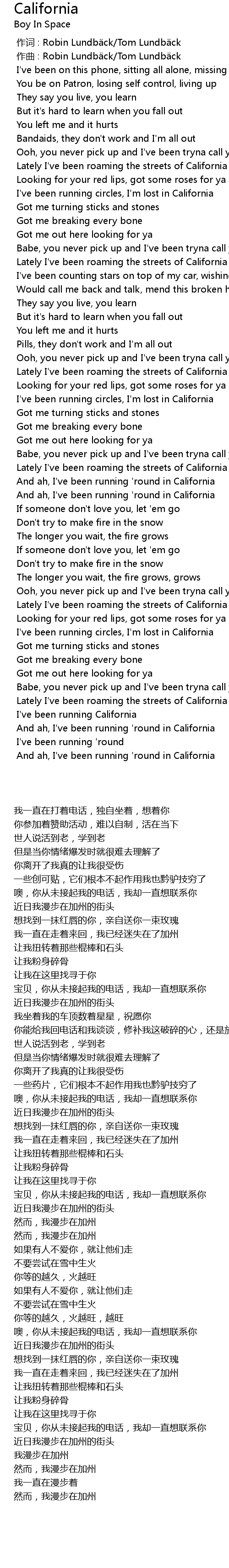 | [00:45.585] | I' ve been running circles, I' m lost in California |