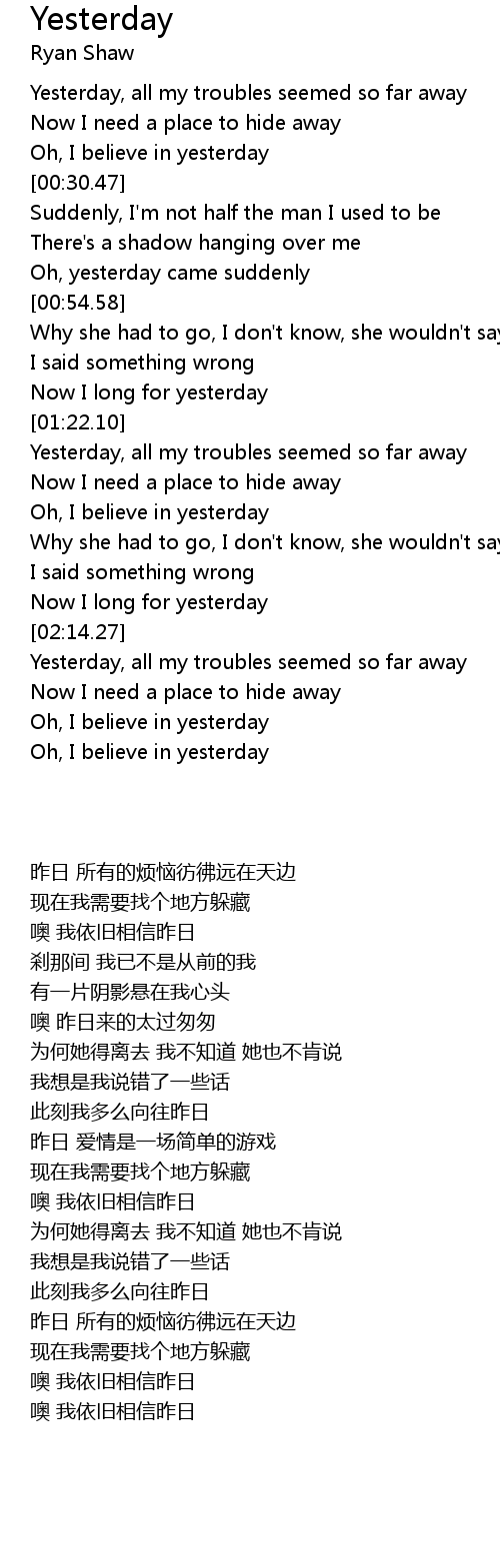 | [02:16.88] | Yesterday, all my troubles seemed so far away |