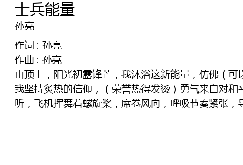 | 山顶上,阳光初露锋芒,我沐浴这新能量,仿佛(可以飞翔)。看,战车经过的地上,祖国土壤在激荡,前进的方向,没有彷徨(奔赴战场)。坦克,全速飞驰在路上,心情像燃烧一样,我们的心脏,跳动节奏随着发动机的气缸,武装,所有的行囊,装满士兵能量。 | |