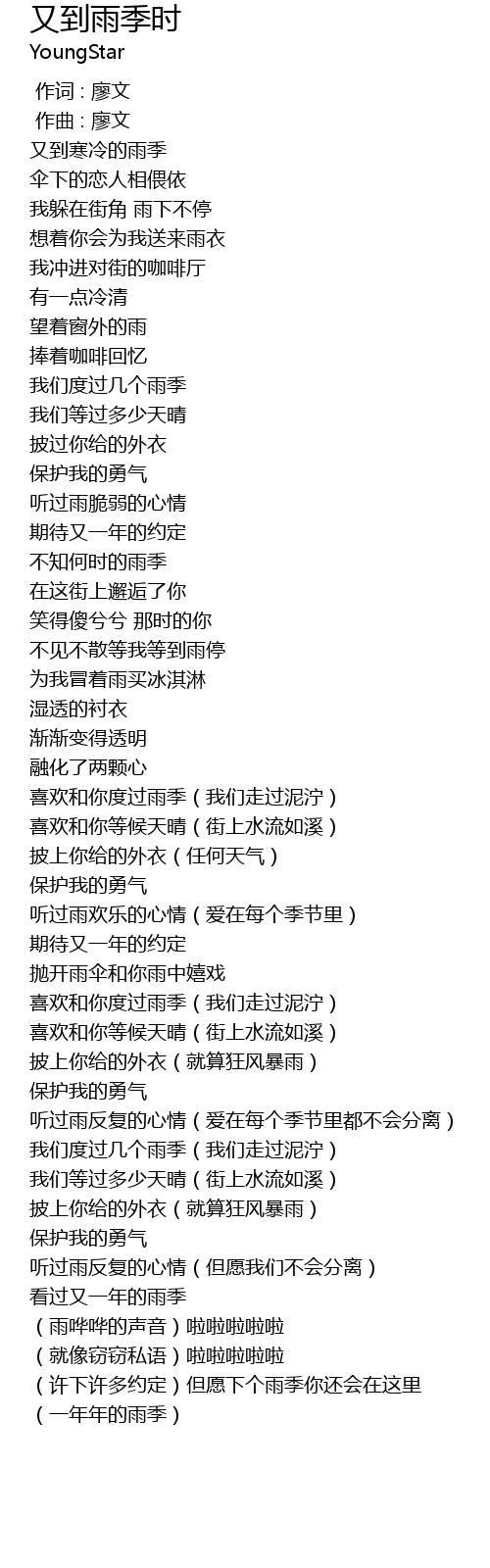 | [03:15.429] | 听过雨反复的心情(爱在每个季节里都不会分离) |