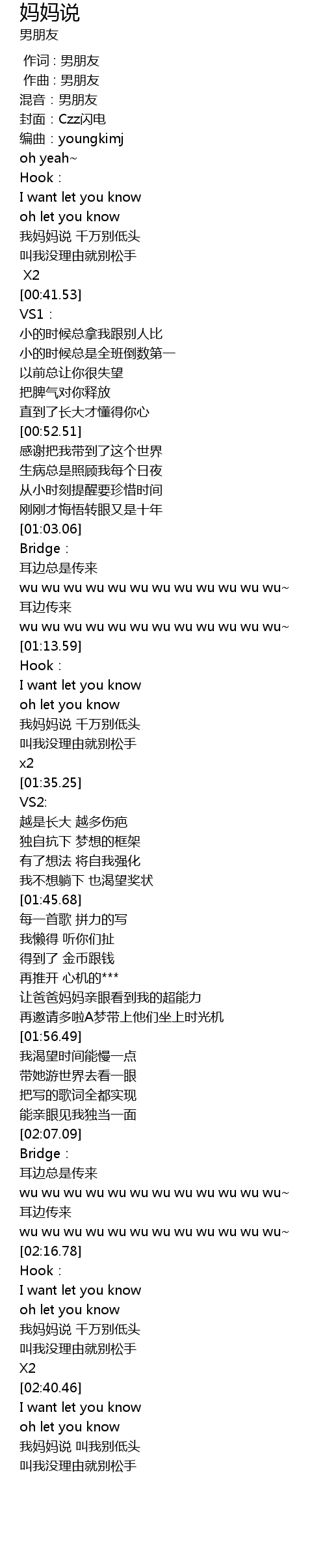 | [02:54.63] | 我妈妈说 叫我别低头 |