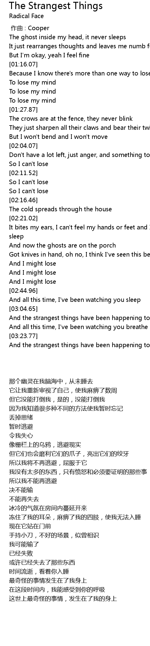 | [03:24.33] | And the strangest things have been happening to me, oh |