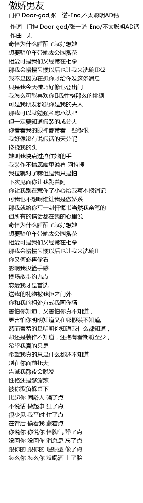 | [00:00.000] | 作词 : 门神 Door-god/张一诺-Eno/不太聪明AD钙 |