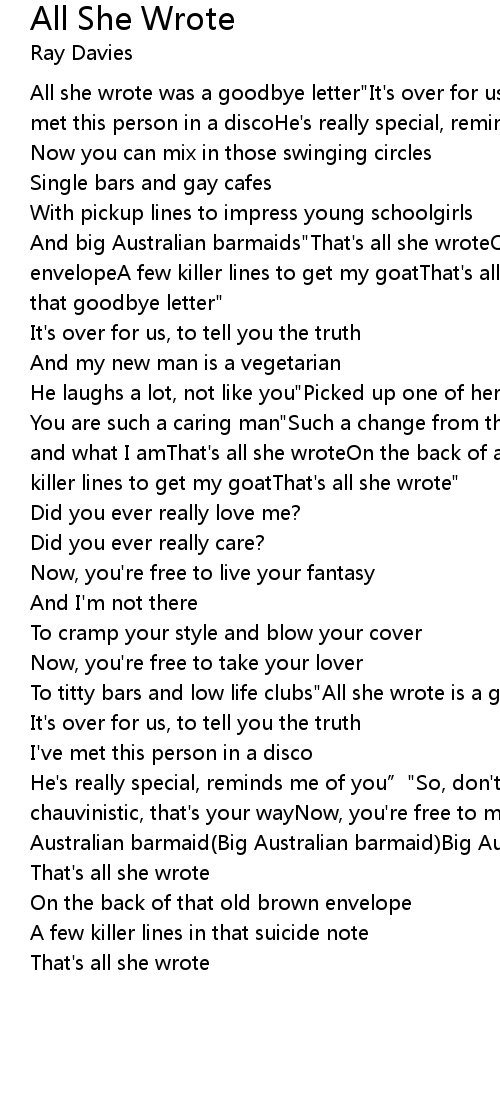 | And big Australian barmaids" That' s all she wroteOn the back of that old brown envelopeA few killer lines to get my goatThat' s all she wroteAll she wrote on that goodbye letter" | |