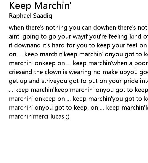 when there's nothing you can dowhen there's nothing you can say'cause everything aint' going to go your wayif you're feeling kind of strange and you want to lay it downand it's hard for you to keep your feet on solid groundyou got to keep, on ... keep marchin'keep marchin' onyou got to keep, on ... keep marchin'keep marchin' onkeep on ... keep marchin'when a poor girl shines and a rich girl criesand the clown is wearing no make upyou goot to get up and run, you got to get up and striveyou got to put on your pride into making ityou got to keep, on ... keep marchin'keep marchin' onyou got to keep, on ... keep marchin'keep marchin' onkeep on ... keep marchin'you got to keep, on ... keep marchin'keep marchin' onyou got to keep, on ... keep marchin'keep marchin' onkeep on ... keep marchin'merci lucas ;) |